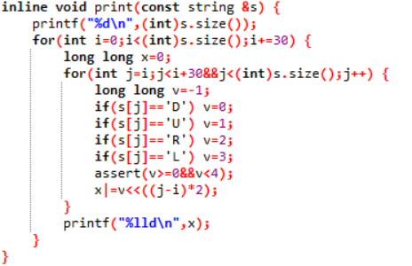 | inline void print(const string &s) { printf("%d\n",(int)s.size()); for(int i=0;i<(int)s.size();i+=30) { long long x=0; for(int j=i;j<i+30&&j<(int)s.size();j++) { long long v=-1; if(s[j]=='D') v=0; if(s[j]=='U') v=1; if(s[j]=='R') v=2; if(s[j]=='L') v=3; assert(v>=0&&v<4); x|=v<<((j-i)*2); } printf("%lld\n",x); } }